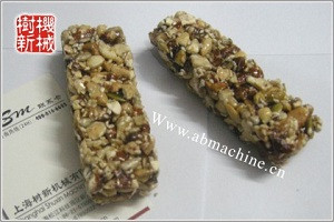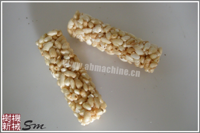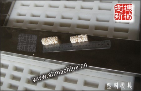 打料好的米花糖或花生仁糖糖后放入制作機的切料斗中,制作機分手后分配、柔壓、冷卻塔、起模出所制品。